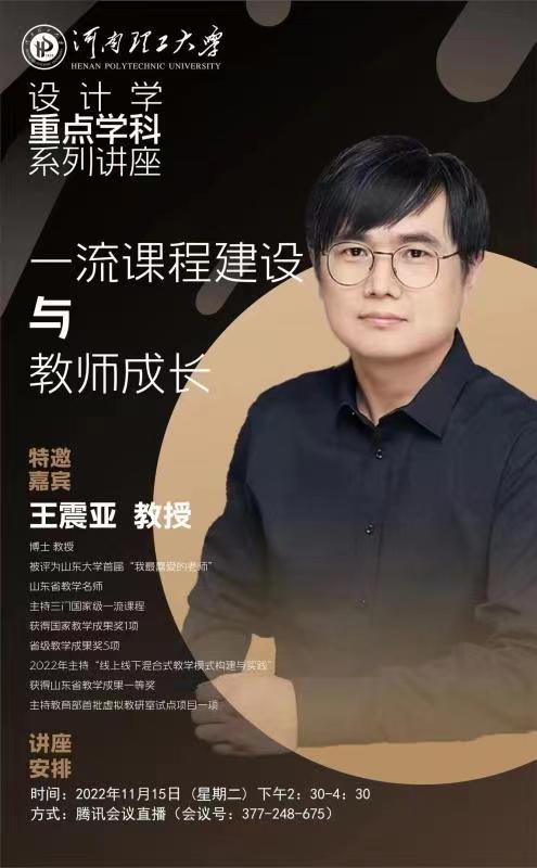学科发展,2022年11月15日下午,由设计学重点学科牵头,91porn特邀山东大学工业设计专业王震亚教授作题为《一流课程建设与教师成长》专题讲座。由91porn