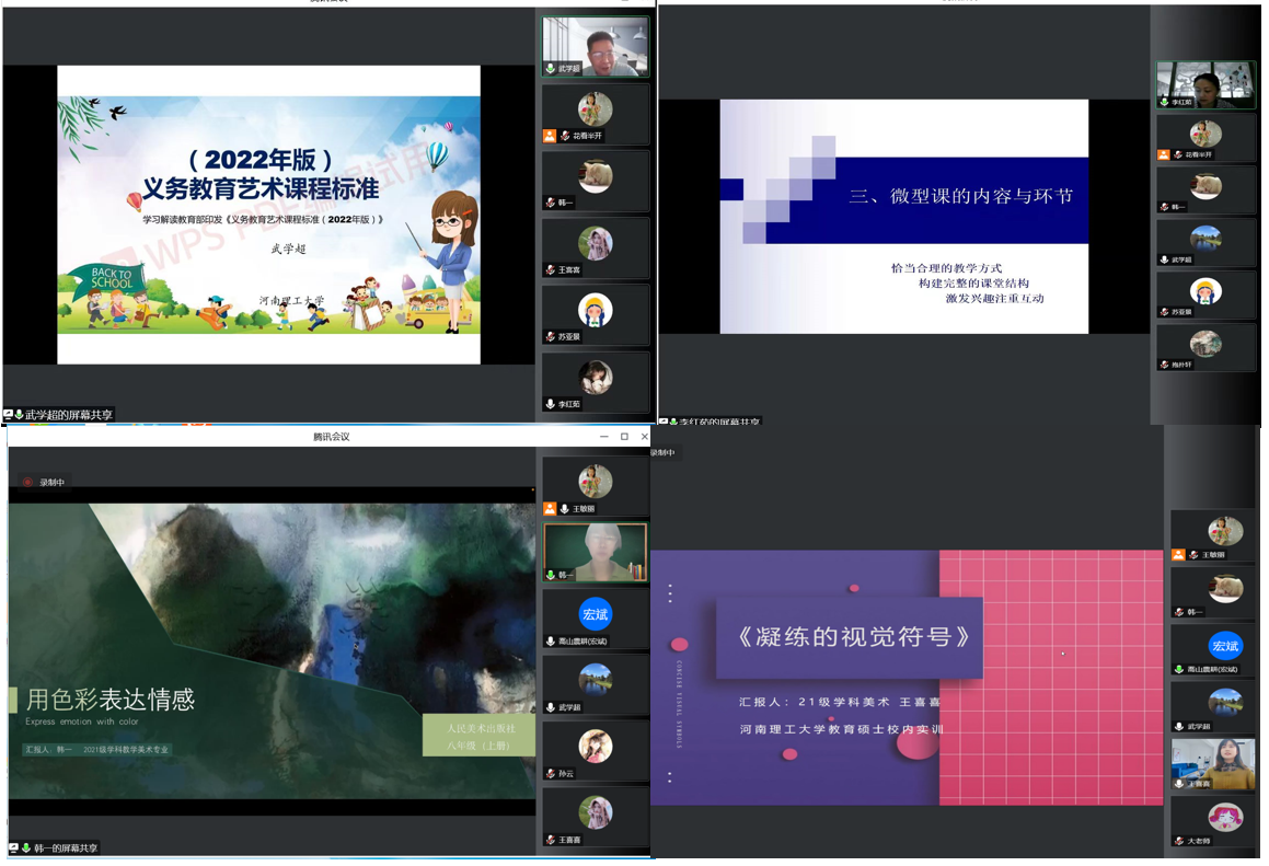 通过线上开展了2021级学科教学(美术)专业硕士生校内实训实践活动。本次活动由韩宏斌副院长主持,教育硕士管理中心主任武学超教授、焦作市解放区教育局美术调研员李红茹、全体学科教学(美术)专业导师及硕士生参加活动。