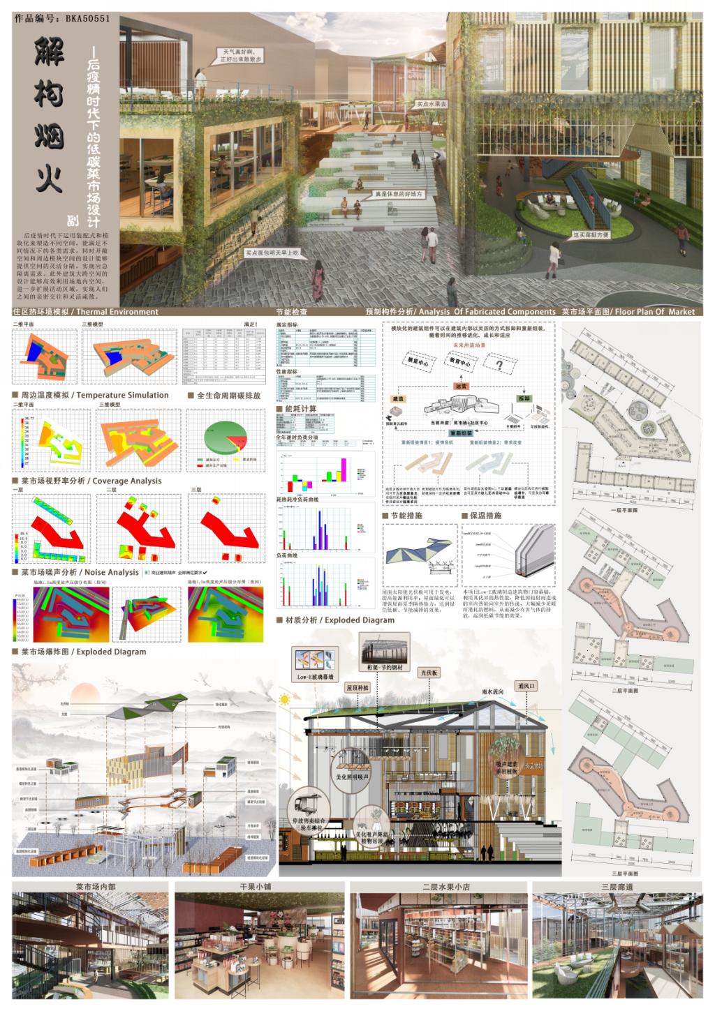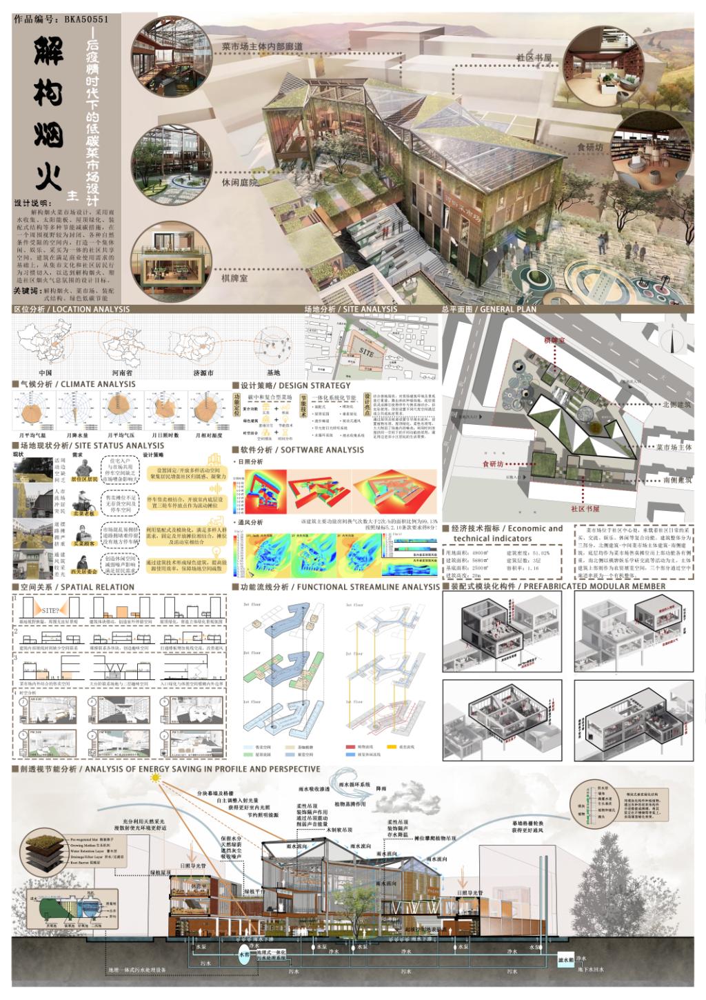 解构烟火(等奖):基地位于河南省济源市济水大街与荆梁路交叉口附近,本项目在农贸市场原址上进行菜市场的设计与建造。设计整体分为三个部分,北侧建筑-中间菜市场主体建筑-南侧建筑,三个部分通过空中廊道串联为一个有机整体。项目采用雨水收集、太阳能板、屋顶绿化、装配式结构等多种节能减碳措施,打造一个集休闲、娱乐、采买为体的社区共享空间。同时,建筑通过装配式空间增加菜市场功能多元性和灵活性