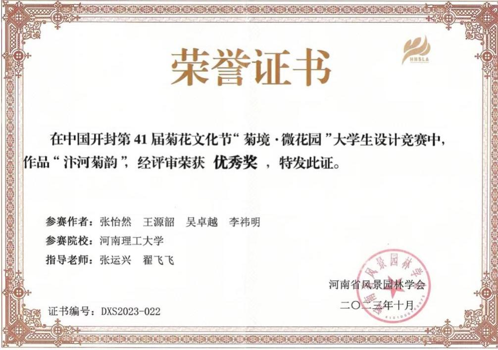 2023年下半年,由河南省风景园林学会主办的“中国开封第41届菊花文化节”征集设计作品。全国50余所院校350余名学生提交了设计作品。这也是91porn师生在该赛事获得的首次荣誉。获奖作品分别由张运兴、翟飞飞两位老师指导。《汴河菊韵》以小见大,彰显了开封地域文化特色和千年古都的迷人风韵,表现了中华民族乘风破浪、勇往直前的宏伟气魄,蕴含了祝福伟大祖国前程似锦、繁荣昌盛的赤子心愿。《汴城菊境·金蕊流霞》营造了永恒、宁静与热情的氛围,表达了人生要充满无限希望的主旨。