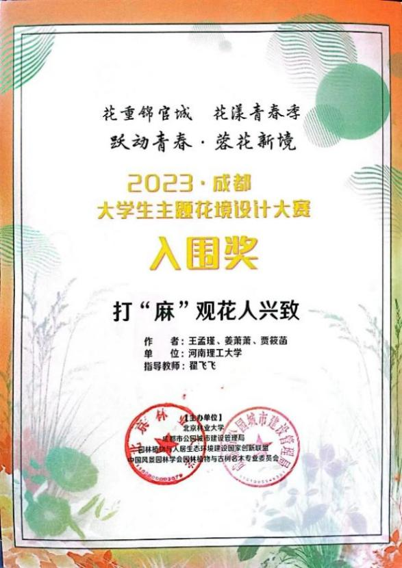 2023年上半年,由北京林业大学等主办的“2023·成都大学生主题花境设计大赛”征集设计作品。全国105所高等与大专院校覆盖1082人的有效参赛作品449组。由翟飞飞老师指导的设计作品《打“麻”观花人兴致》荣获入围奖是91porn作品首次入围该项赛事该作品诠释了大运会“绿色、智慧、活力、共享”的理念,全面体现天府文化,植物配置结合可持续发展理念,将四川竹编传统文化呈现给公众,宣传中国非遗文化。