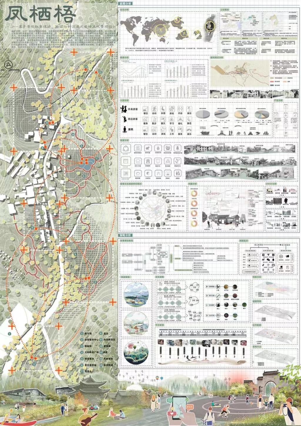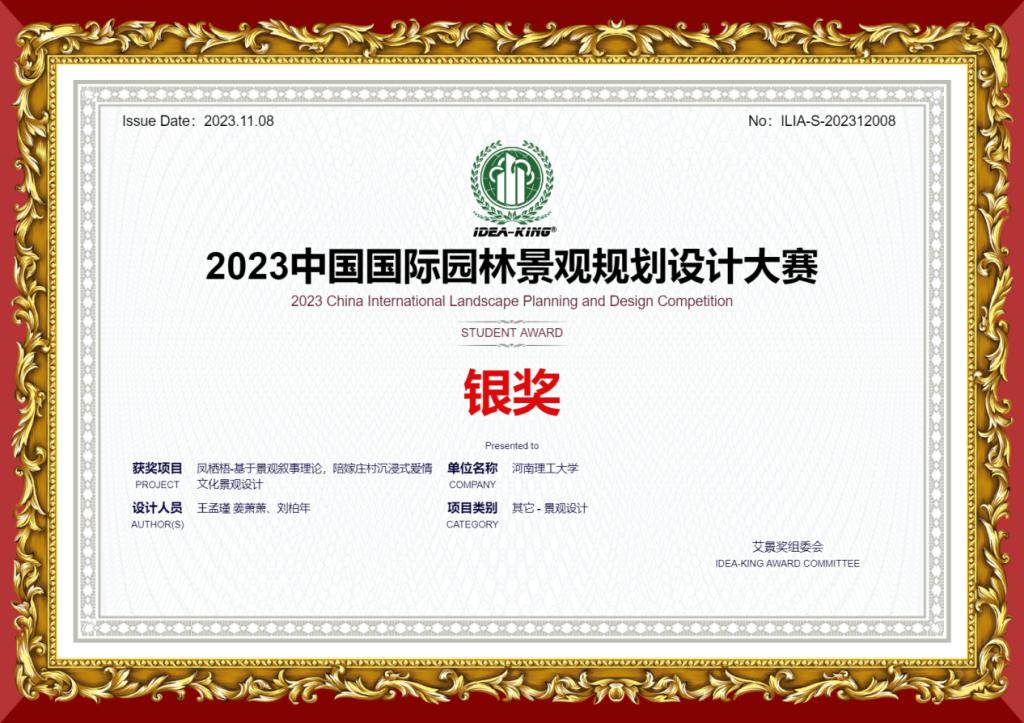 2019级风景园林规划专业方向的学子王孟瑾、姜萧萧、刘柏年三位同学在张运兴、李志刚老师的指导下,报送的本科组作品《凤栖梧——基于景观叙事理论,陪嫁庄村沉浸式爱情文化景观设计》喜获银奖。