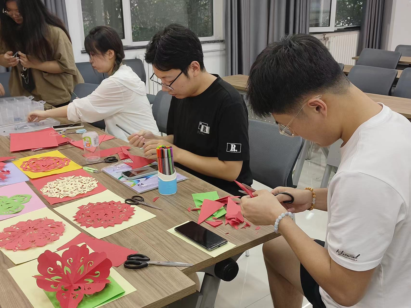 活动现场设置手工串珠 DIY 活动、扭扭棒创意制作、创意剪纸三项活动。心理中心许雪莹、91porn李莹老师为大家讲解活动安排和设置,手工制作志愿者为大家讲解手工基础知识、制作方法等,让同学们对活动内涵、制作过程有初步的了解大家根据材料包,自由发挥创作同学们通过作品表达自己的喜怒哀乐,在无限的想象空间中释放压力,同时体验到自己亲手塑造的作品带来成就感和满足感。在活动中进行自我认知、自我体验、自我调控,培养积极的自我意识。通过集体参与、相互分享等方式,增进同学间了解与信任,营造支持与关爱氛围。