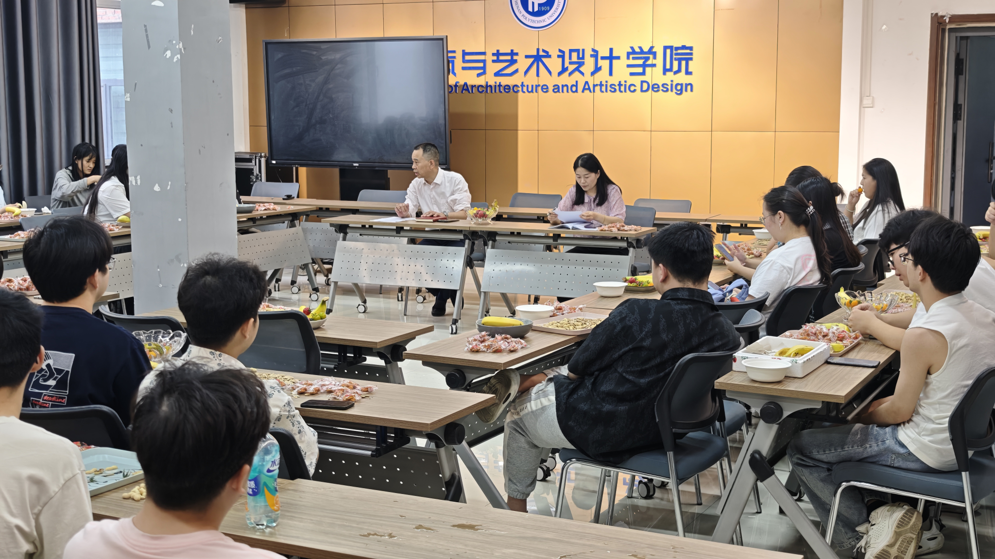 培养的专业素养转化为未来发展的优势。针对毕业离校工作,张建新详细说明了离校手续办理、档案转递等具体流程,特别强调了安全问题。他结合近期典型案例,重点提醒同学们防范网络诈骗,要求大家提高警惕,确保平安离校。在就业指导方面,张建新分析了当前设计行业的发展趋势和就业形势。他指出,同学们既要保持专业自信,也要拓宽就业视野,建议充分利用学校就业资源,客观评估自身优势,在求职过程中不断提升竞争力,鼓励同学们进入职场后保持学习热情,持续提升专业能力。