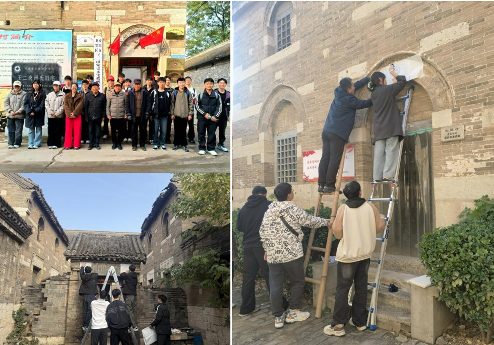 王二岗村不仅拥有丰富的古建筑遗存,更是底蕴深厚的红色教育基地,村内保留的邢氏旧宅、九门相照建筑群等清代建筑,是研究传统建筑工艺的宝贵样本。测绘工作开展前,师生们走进王二岗村红色文化教研基地,在负责人“三老”同志的带领下学习当地革命历史,聆听红色故事,从基层群众的奋斗历程中汲取精神力量。这种“专业实践+红色教育”的模式,让同学们在锤炼本领的同时,进一步坚定了理想信念,明白了青年一代的责任与担当。在古建筑测绘现场,建筑学专业师生对省级文物保护单位的清代建筑展开系统性勘察,同学们以小组为单位,分工协作完成建筑登记、面积丈量、材料记录等工作,尤其对建筑上的雕刻图案进行细致描摹,深入探究其工艺技法与文化内涵。师生们展现出理工学子严谨务实的专业素养,用实际行动诠释着“明德任责”的校训精神。