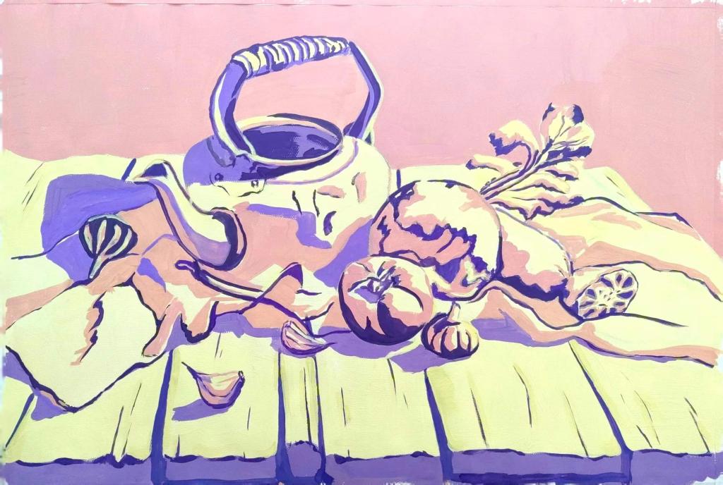 刘雪纯(设计类2206班):通过此次课程,培养了我们从只会观察物体表面到深入观察物体的思想转变,学会了将每副画带有自己的理解与感情融入画中。让我们对于色彩的表达更加灵活,多样。