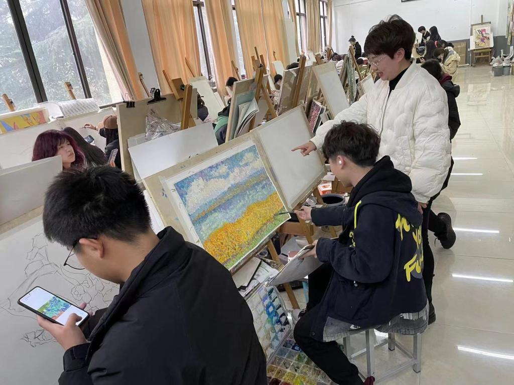 宋高洁(设计类2201):色彩是一门深奥的学问。来自生活的色彩灵感,浓妆淡抹总相宜,有温柔的色彩,有斑驳陆离的色彩情感,色彩线条下的情感。通过课程学习,加强了同学们对色彩的训练,不管是平面构成还是点彩,都让我们受益匪浅。